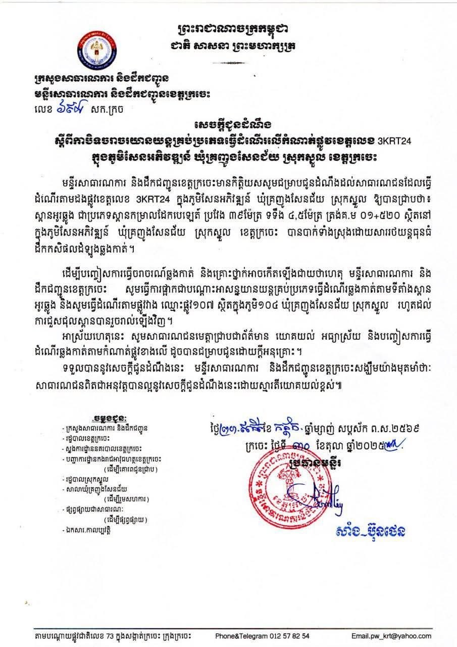បច្ចុប្បន្ន ក្រុមការងារមន្ទីរសាធារណការខេត្ត បានសហការជាមួយ រដ្ឋបាលស្រុកស្នួល កម្លាំងអធិការស្រុកស្នួល និង អាជ្ញាធរគ្រប់លំដាប់ថ្នាក់ កំពុងចុះសម្រួលស្ថានការណ៍នៅទីតាំងកើតហេតុ និងចាត់ចែងតាមនីតិវិធីច្បាប់ ដើម្បីរៀបចំដោះស្រាយបញ្ហាការធ្វើដំណើររបស់ប្រជាពលរដ្ឋឡើងវិញ៕