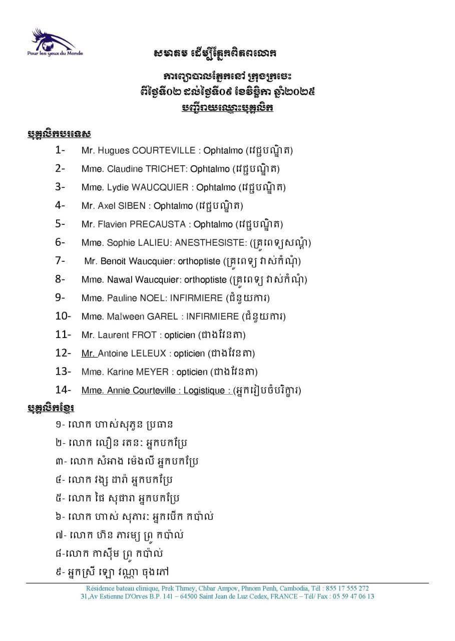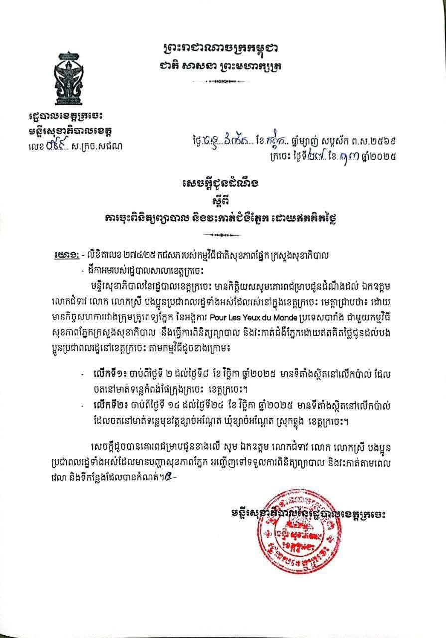 សេចក្តីជូនដំណឹងស្តីពីការចុះពិនិត្យព្យាបាល និងវះកាត់ជំងឺភ្នែកដោយឥតគិតថ្លៃ របស់ក្រុមគ្រូពេទ្យភ្នែក នៃអង្គការ Pour Les Yeux du Monde ប្រទេសបារាំង ជាមួយកម្មវិធីសុខភាពភ្នែកក្រសួងសុខាភិបាល។
