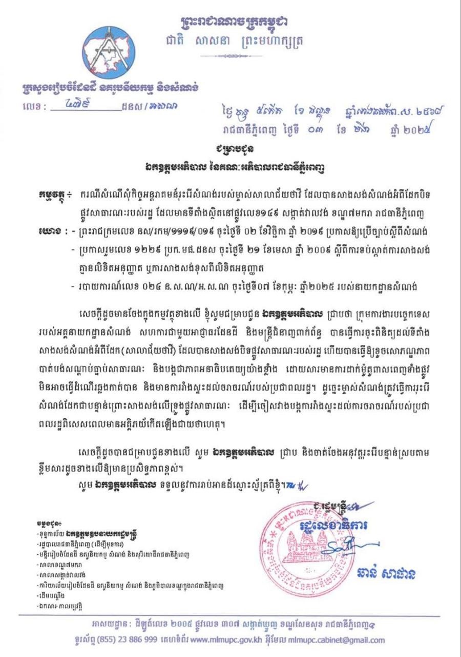 ទាក់ទងនឹងបញ្ហានេះ ក្រសួងរៀបចំដែនដី នគរូបនីយកម្ម និងសំណង់ កាលពីថ្ងៃទី៤ ខែវិច្ឆិកា ឆ្នាំ២០២៥ បានឱ្យដឹងថា ការសម្រេចឱ្យម្ចាស់សំណង់សាលាជ័យថាវី ធ្វើការរុះរើសំណង់របស់ខ្លួន ក្រសួងបានធ្វើការពិនិត្យ ចុះទៅកាន់ទីតាំងសំណង់ជាក់ស្តែង និងឃើញថា សំណង់នេះ បានសាងសង់ពីដែកសម្រាប់ប្រើប្រាស់ជារោងសម្រាប់ចំណតកង់-ម៉ូតូ របស់បុគ្គលិក និងសិស្ស ដែលមកបង្រៀន ឬរៀននៅសាលាជ័យថាវី។ សំណង់នេះ បានសាងសង់បិទផ្លូវលេខ១៤៩ ដែលជាផ្លូវសាធារណៈ បង្កឱ្យមានភាពអាណាធិបតេយ្យ និងបាត់បង់សណ្តាប់ធ្នាប់ ដោយការដាក់កង់ ម៉ូតូពាសពេញផ្លូវ។ សំណង់ដែលបិទផ្លូវបែបនេះ មិនត្រឹមតែធ្វើឱ្យខូចសោភ័ណភាព សណ្តាប់ធ្នាប់ប៉ុណ្ណោះនោះទេ តែវាធ្វើឱ្យប៉ះពាល់ដល់លំហូរចរាចរក្នុងតំបន់ ព្រមទាំងសុវត្ថិភាព និងការសង្រ្គោះនានានៅពេលមានអគ្គិភ័យកើតឡើងជាយថាហេតុ។