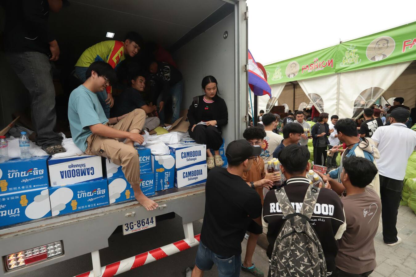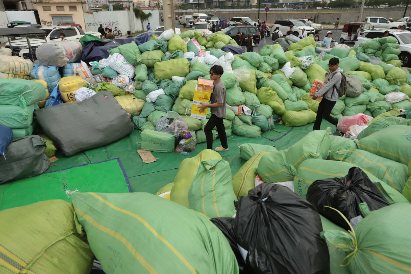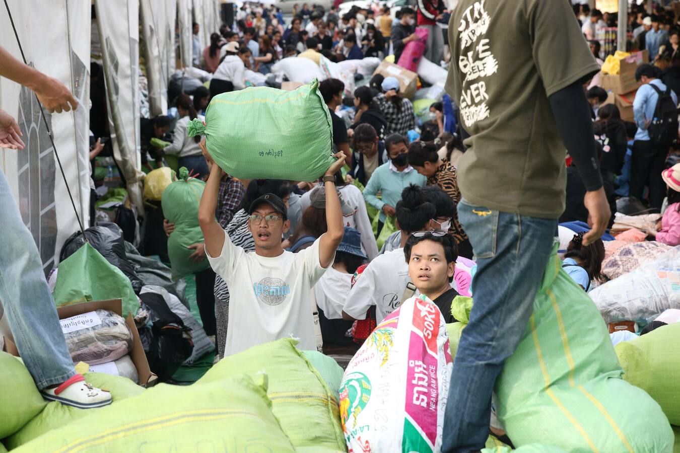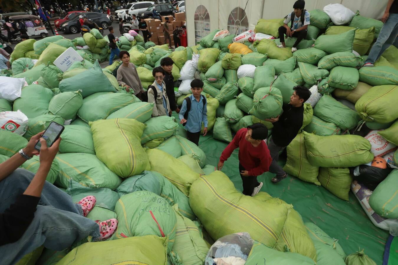 ទិដ្ឋភាពរបស់បងប្អូនប្រជាពលរដ្ឋ មន្ត្រីរាជការ ក្មេងចាស់ប្រុសស្រី ដែលរស់នៅរាជធានីភ្នំពេញ នាំគ្នាយកស្បៀងអាហារ គ្រឿងឧបភោគបរិភោគ និងថវិកា មកទីតាំងទទួលការបរិច្ចាគរបស់ក្រុមហ៊ុនភ្នំពេញស៊ីធីសេនធ័រ ដែលស្ថិតនៅតំបន់បឹកកក់ សង្កាត់ស្រះចក ខណ្ឌដូនពេញរាជធានីភ្នំពេញ នាថ្ងៃទី១០ ខែធ្នូ ឆ្នាំ២០២៥នេះ ដើម្បីចែកជូនវីរកងទ័ព និងជនភៀសសឹក។