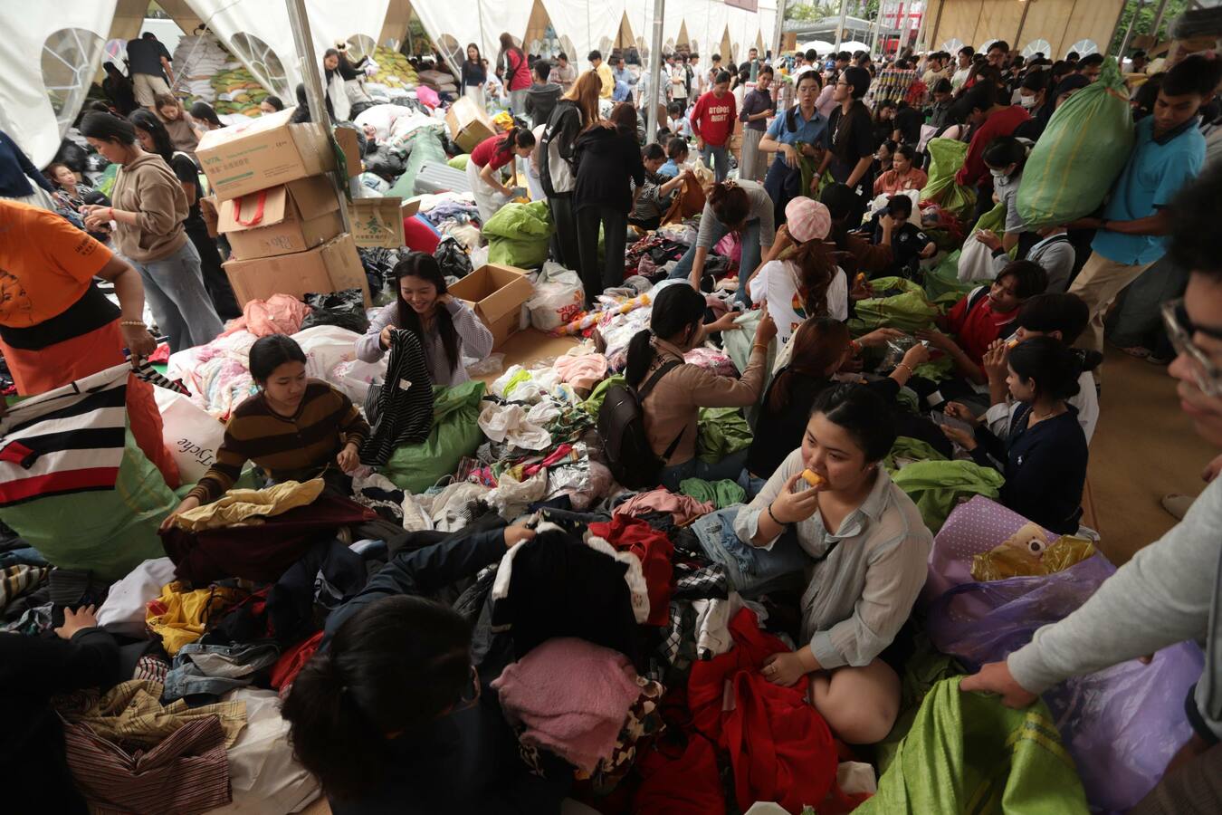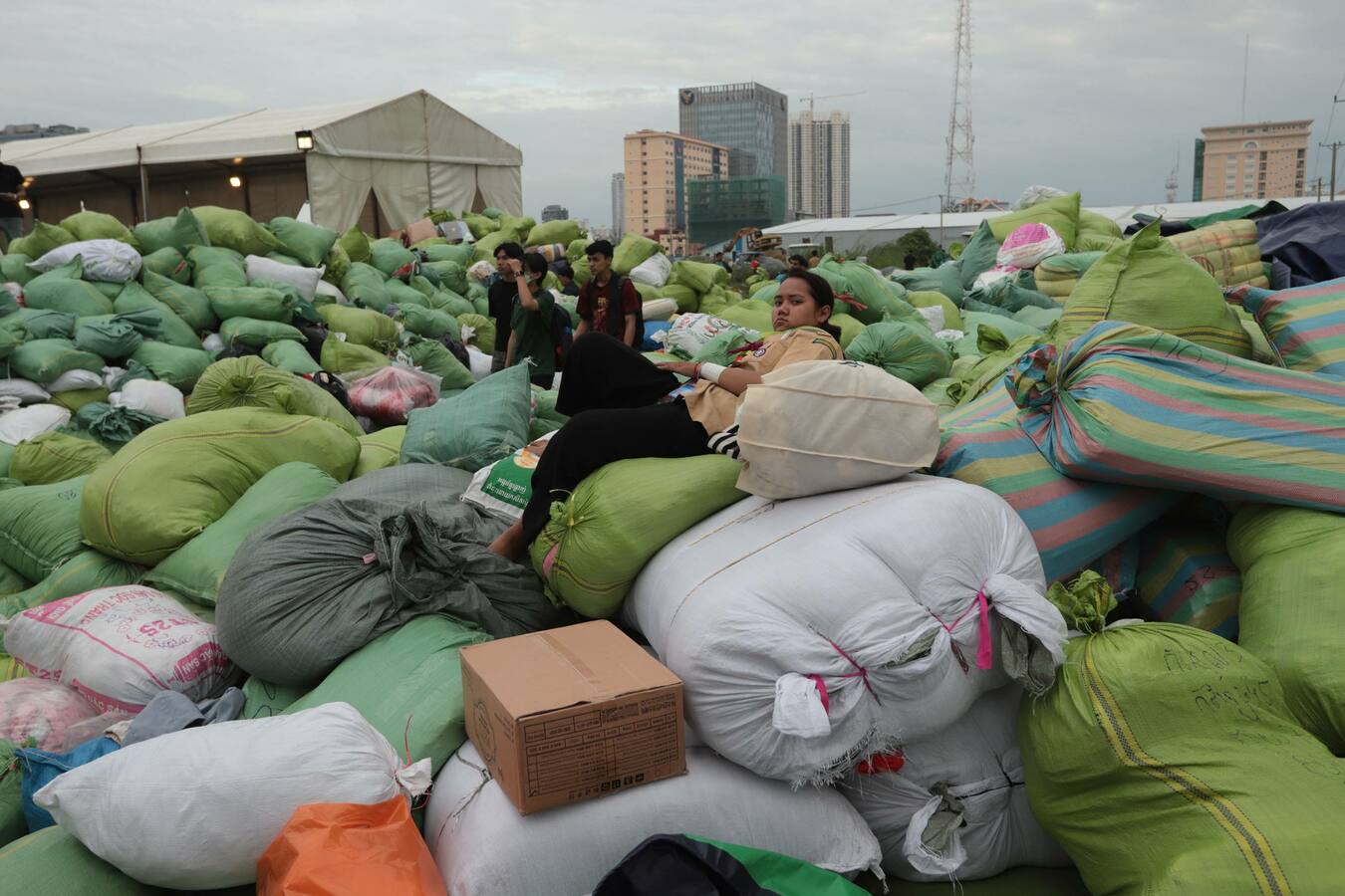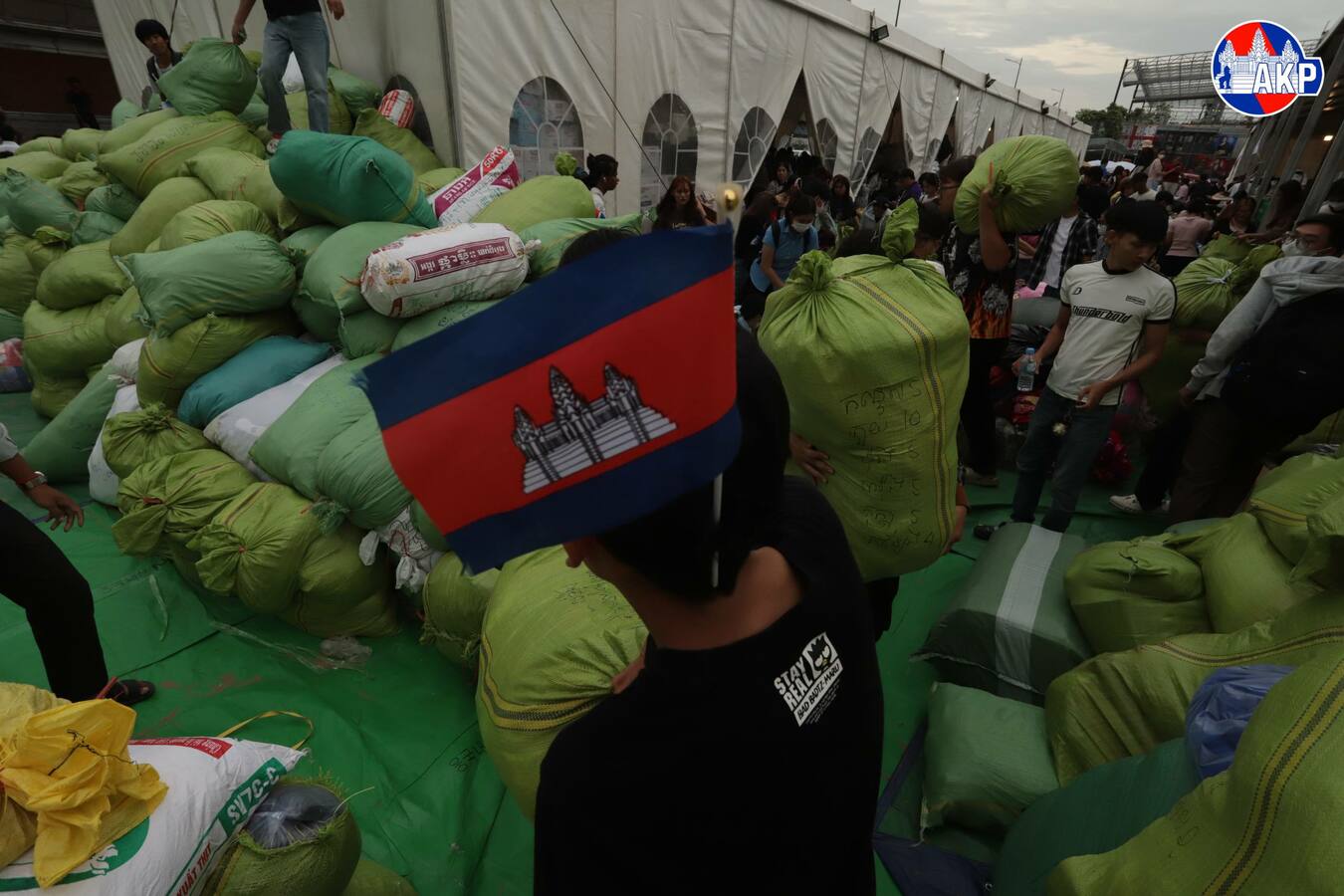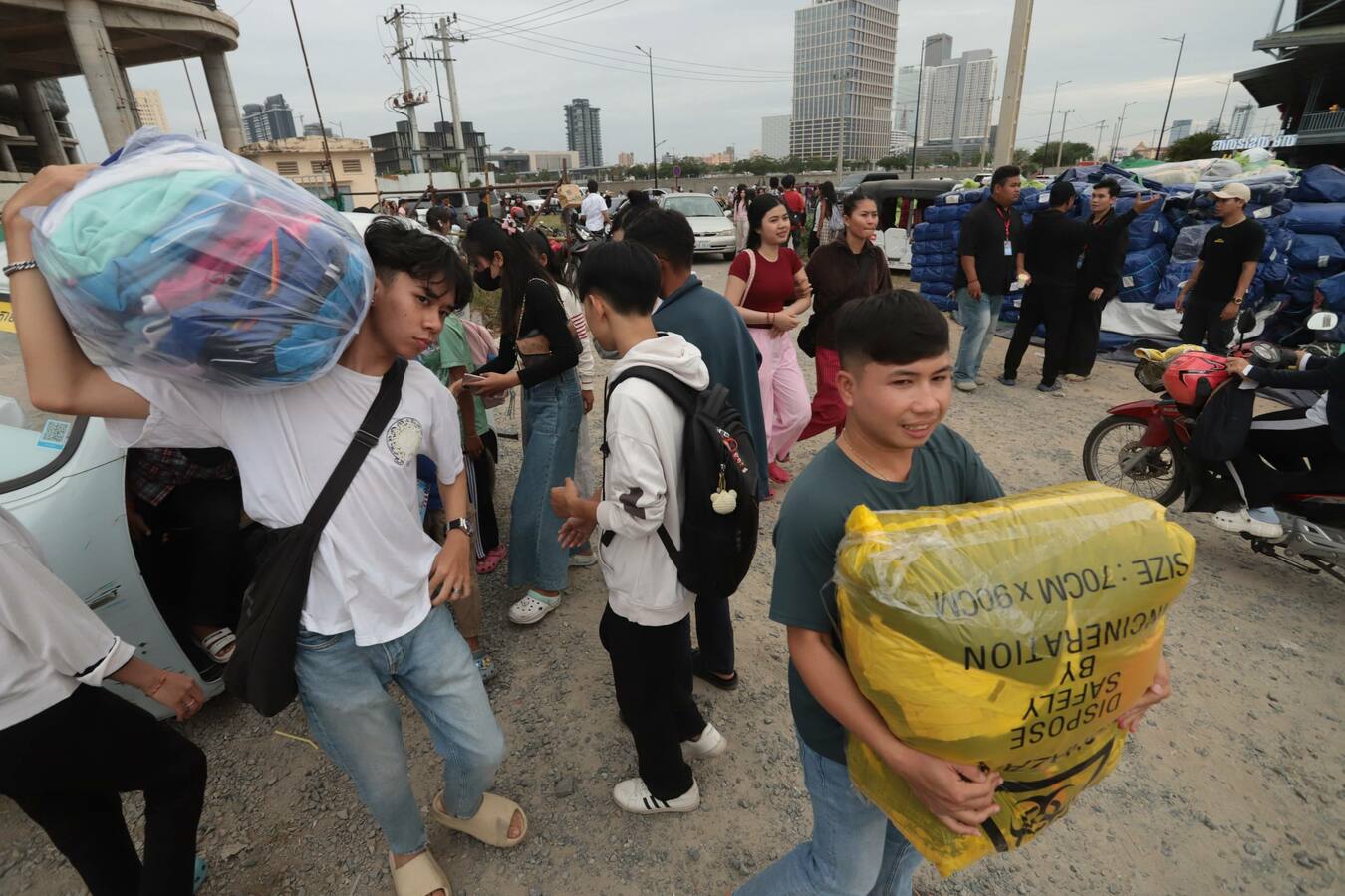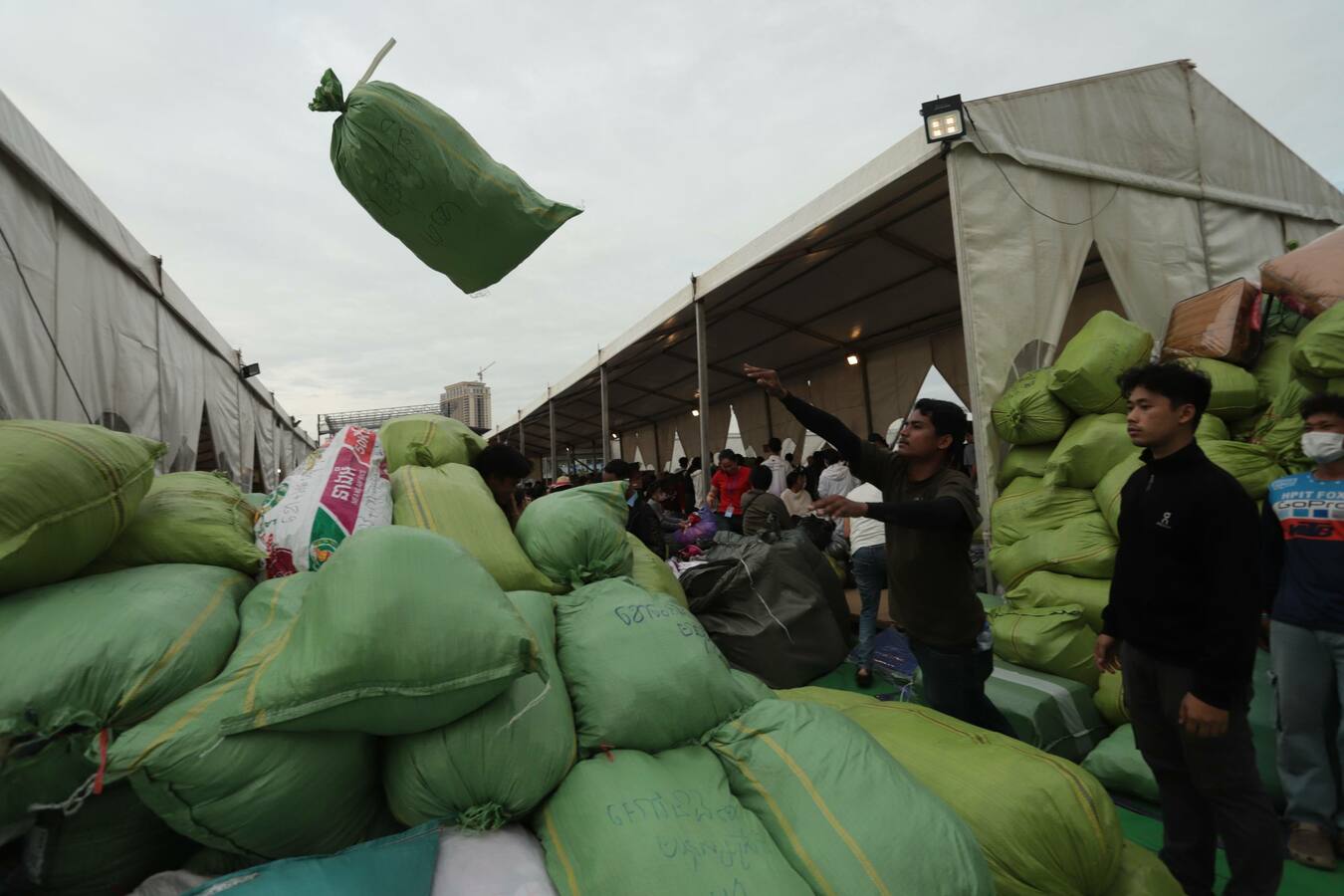 ទិដ្ឋភាពរបស់បងប្អូនប្រជាពលរដ្ឋ មន្ត្រីរាជការ ក្មេងចាស់ប្រុសស្រី ដែលរស់នៅរាជធានីភ្នំពេញ នាំគ្នាយកស្បៀងអាហារ គ្រឿងឧបភោគបរិភោគ និងថវិកា មកទីតាំងទទួលការបរិច្ចាគរបស់ក្រុមហ៊ុនភ្នំពេញស៊ីធីសេនធ័រ ដែលស្ថិតនៅតំបន់បឹកកក់ សង្កាត់ស្រះចក ខណ្ឌដូនពេញរាជធានីភ្នំពេញ នាថ្ងៃទី១០ ខែធ្នូ ឆ្នាំ២០២៥នេះ ដើម្បីចែកជូនវីរកងទ័ព និងជនភៀសសឹក។
