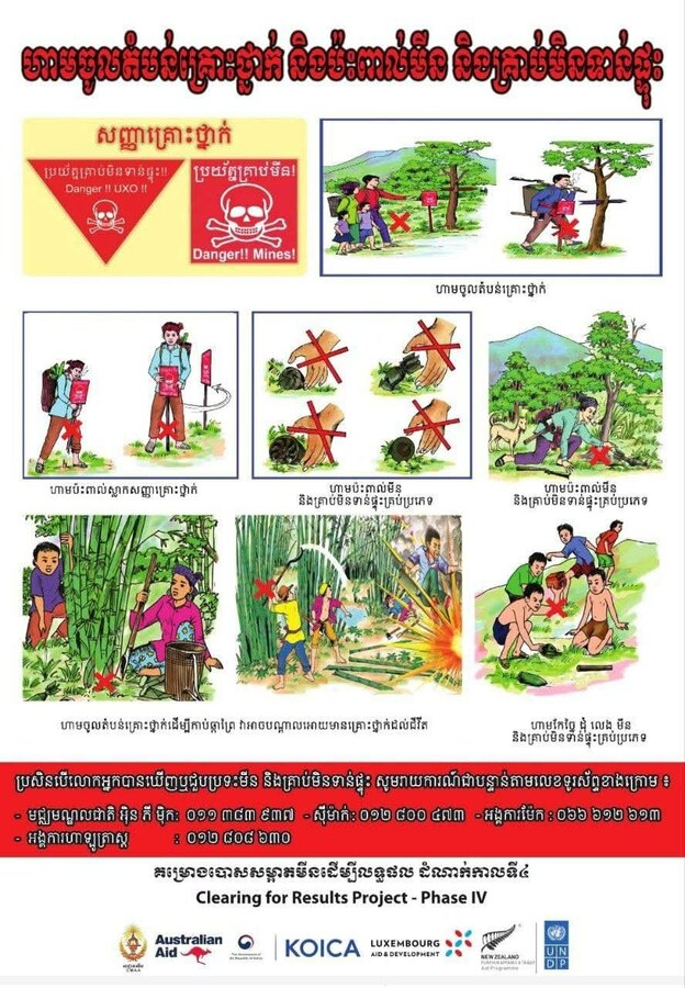 ជាមួយគ្នានេះ អាជ្ញាធរមីនសូមអំពាវនាវ សូមកុំចូលតំបន់ណាដែលសង្ស័យបន្សល់គ្រាប់យុទ្ធភណ្ឌមិនទាន់ផ្ទុះសេសសល់ពីសង្គ្រាម និងមុនចូលតំបន់នោះត្រូវសាកសួរព័ត៍មានពីអាជ្ញាធរមានសមត្ថកិច្ច មេភូមិ មេឃុំ និងប៉ុស្តិ៍នគរបាល។