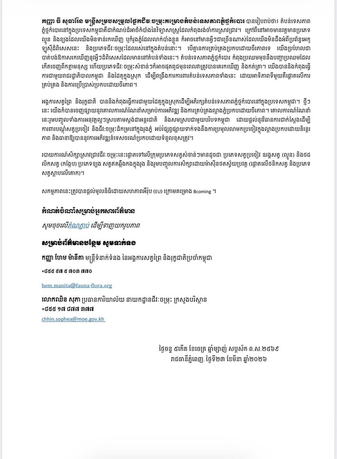 ក្រសួងបរិស្ថាន បានបញ្ជាក់ថា របាយការណ៍ស្តីពីការសិក្សាជីវ:ចម្រុះនៅតំបន់ភ្នំថ្មកំបោរ ដែលបានបោះពុម្ពផ្សាយនៅថ្ងៃទី២៣ ខែមីនា ឆ្នាំ២០២៦នេះ បានបង្ហាញពីប្រភេទសត្វជាច្រើនដែលរស់នៅក្នុងតំបន់ភ្នំថ្មកំបោរនៅក្នុងប្រទេសកម្ពុជា។ តាមរយ:ការសិក្សារូងភ្នំជាង៦០នៅតាមតំបន់ភ្នំចំនួន១០ នៅខេត្តបាត់ដំបងនៃប្រទេសកម្ពុជា ការសិក្សាស្រាវជ្រាវនេះបានរកឃើញសត្វដែលគួរឱ្យចាប់អារម្មណ៍ជាច្រើនដែលមួយចំនួនធំគឺមានតែនៅក្នុងតំបន់ជាក់លាក់នេះប៉ុណ្ណោះ។