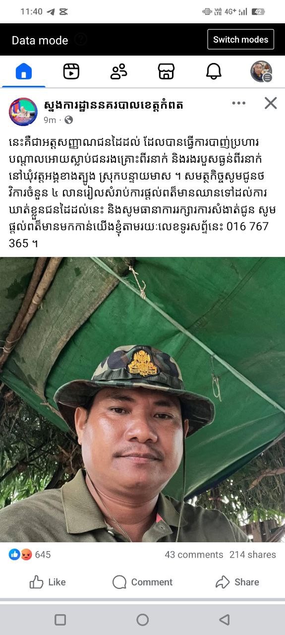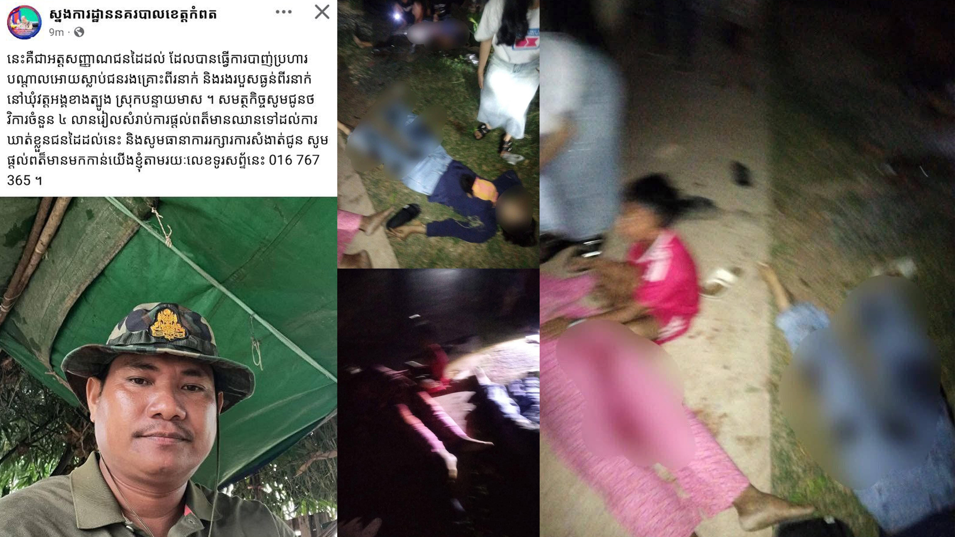 (កំពត) ៖ កាលពីយប់ម៉ោងប្រមាណ ៩៖៣៩នាទីយប់ ថ្ងៃទី២០ ខែកញ្ញា ឆ្នាំ២០២៥ មានករណីបាញ់រះកើតឡើង បណ្តាលឱ្យស្លាប់មនុស្ស ០៣នាក់ របួសធ្ងន់ ០១នាក់ ។ ហេតុការណ៍នេះ បានកើតឡើង នៅភូមិស្រែព្រៃ ឃុំវត្តអង្គខាងត្បូង ស្រុកបន្ទាយមាស ខេត្តកំពត។ ករណីនេះដែរ ក្រោយពេលកើតហេតុ ជនដៃដល់បានជិះម៉ូតូរត់គេចខ្លួនបាត់ស្រមោល តែសមត្ថកិច្ចបានកំណត់មុខសញ្ញាបាន និងកំពុងតាមចាប់ខ្លួន។